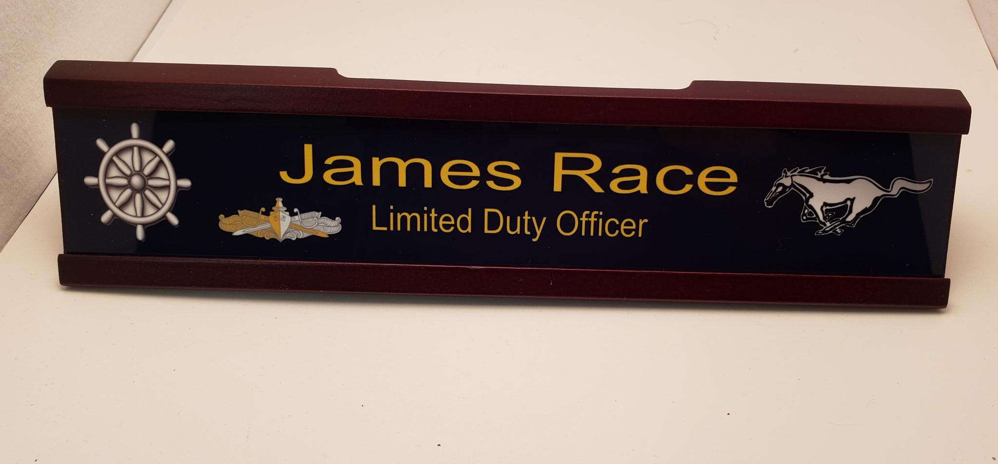 This U.S Navy Mustang Mahogony Executive Desk Nameplate is totally customizable to your needs. Just let us know in the notes while checking out. It even has a business card slot.