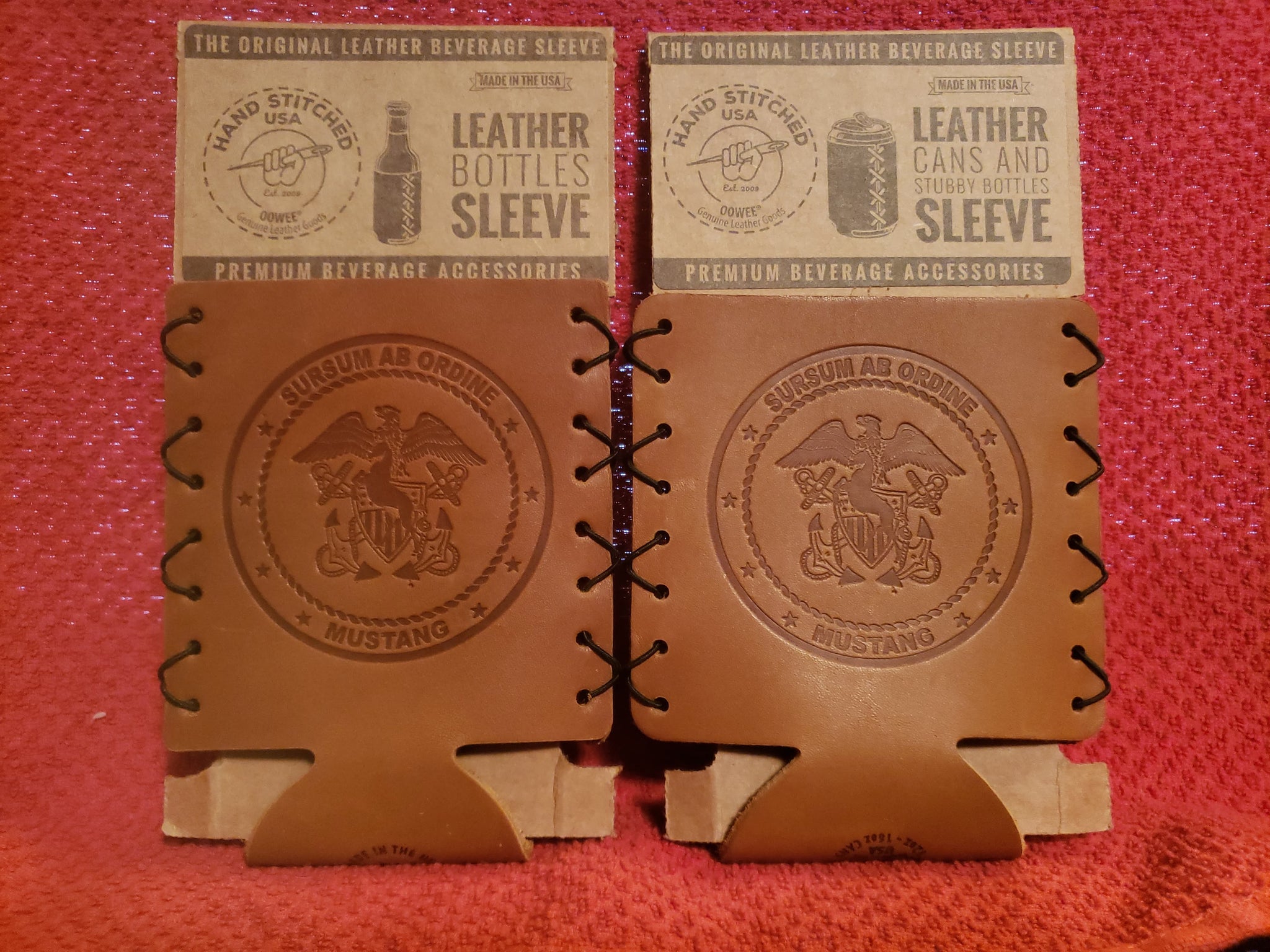 Premium quality leather hand stitched debossed Navy Mustang Koozies for bottles and cans. You choose!