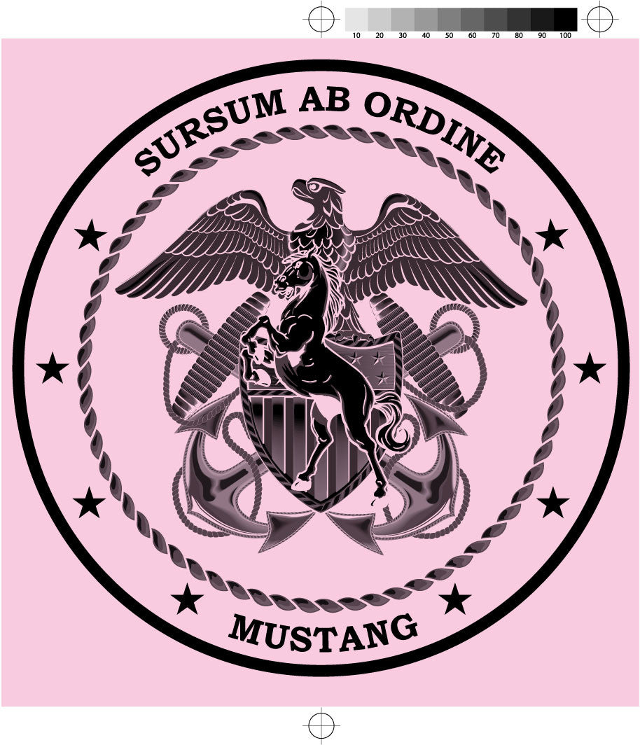 Logo is on the front as well as the back that says "Sursum Ab Ordine" and Mustang".