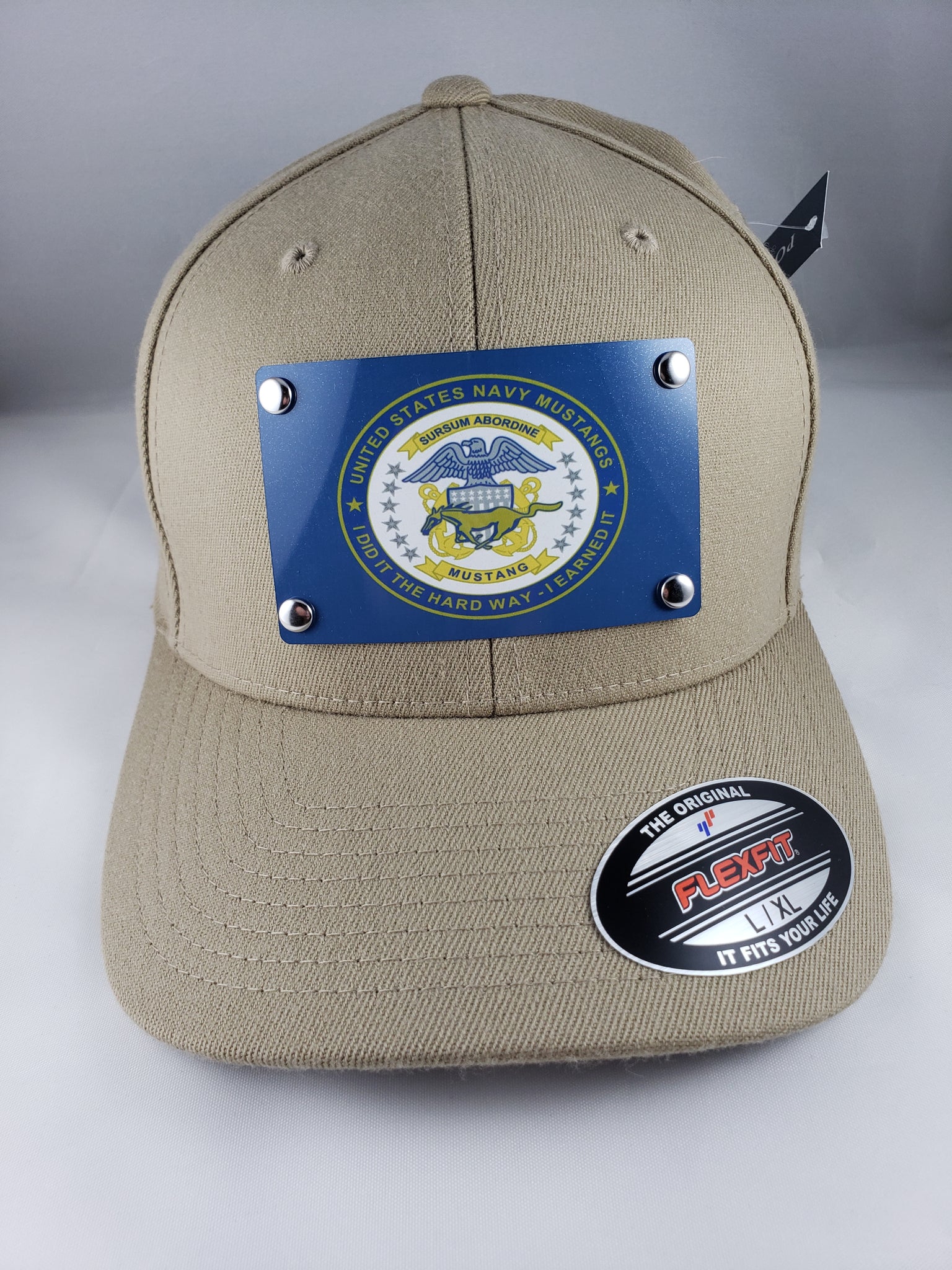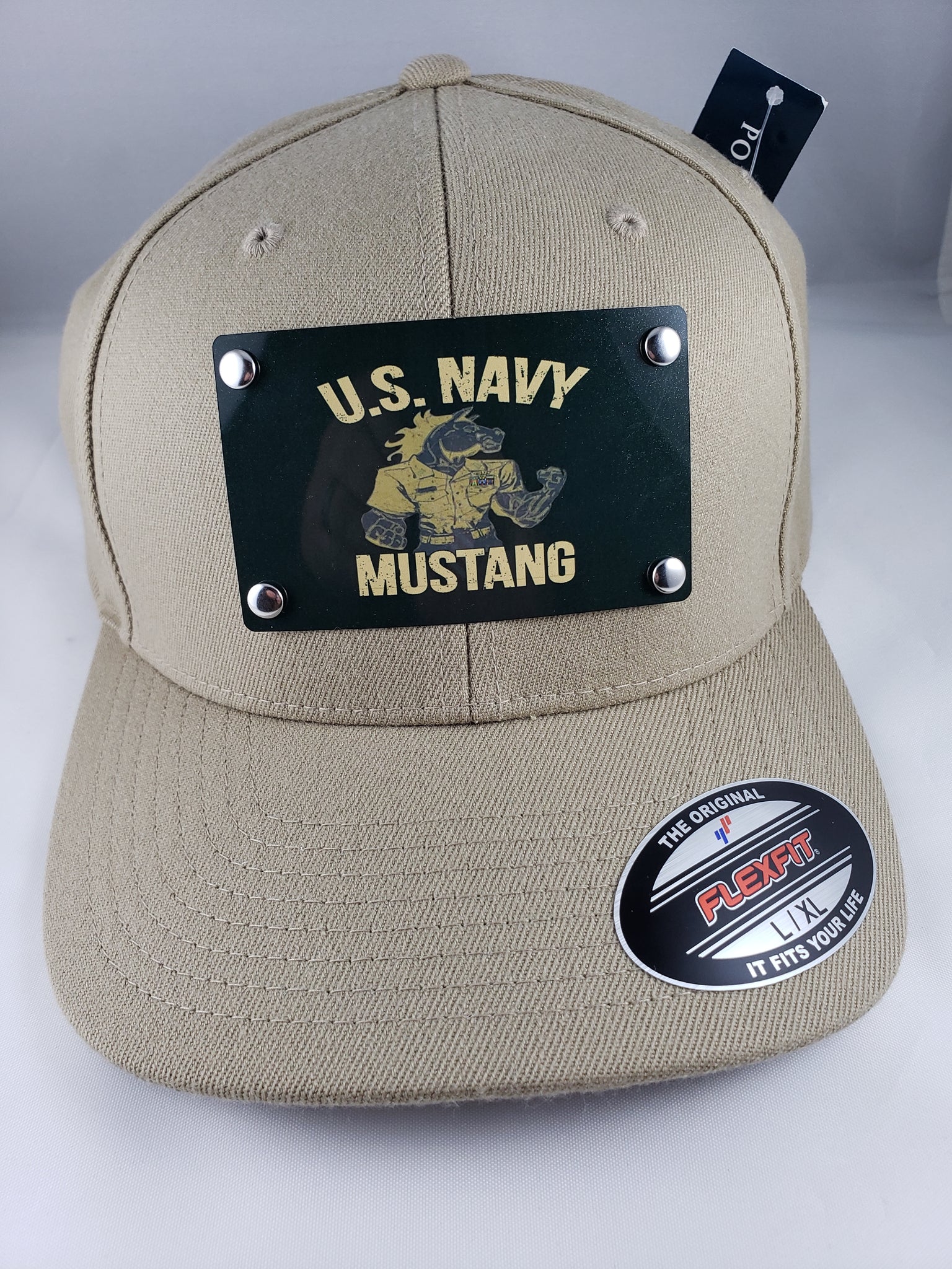 These Navy Mustang hats are one of a kind designs. They're very comfortable, Flex Fit hats with a Mustang design printed on a 3mm aluminum business card.